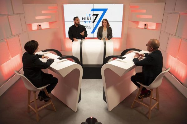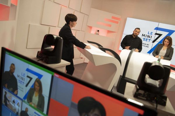 Le Mini Set est un petit studio de tournage en configuration TV mis à disposition avec sa régie 4K et son équipe technique.
